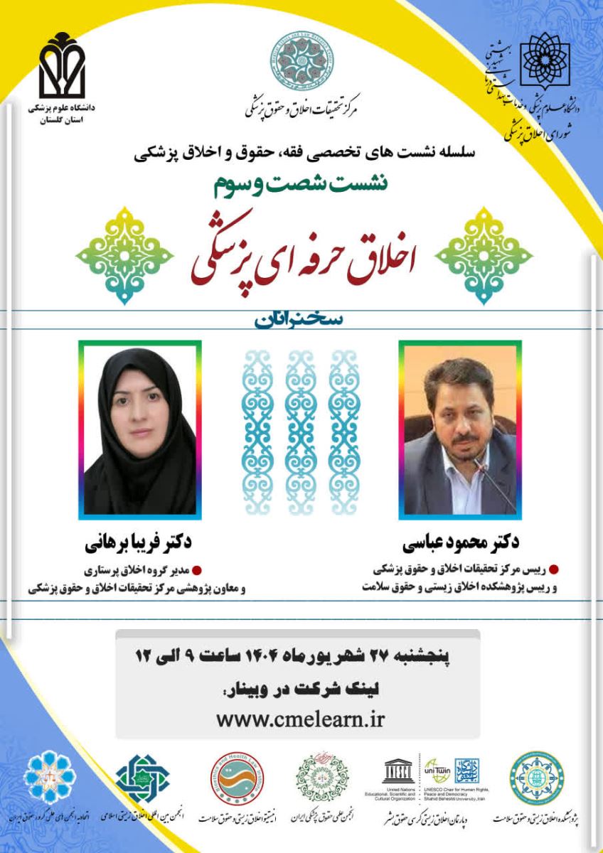 سلسله نشستهای تخصصی فقه، حقوق و اخلاق پزشکی ؛ نشست شصت و سوم با عنوان «اخلاق حرفه ای پزشکی» با تدریس جناب آقای دکتر محمود عباسی و سرکار خانم دکتر فریبا برهانی به صورت وبینار در روز پنجشنبه به تاریخ ۲۷ شهریور ماه ۱۴۰۴ از ساعت ۰۹:۰۰ الی ۱۲:۰۰ برگزار میگردد.